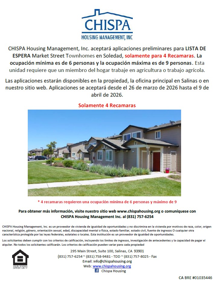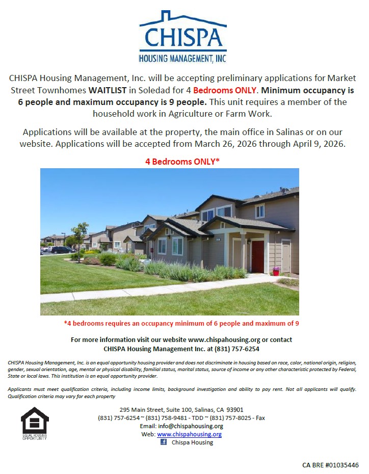 CHISPA Housing Management, Inc. will be accepting preliminary applications for Market Street Townhomes WAITLIST in Soledad for 4 Bedrooms ONLY. Minimum occupancy is 6 people and maximum occupancy is 9 people. This unit requires a member of the household work in Agriculture or Farm Work.